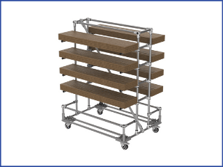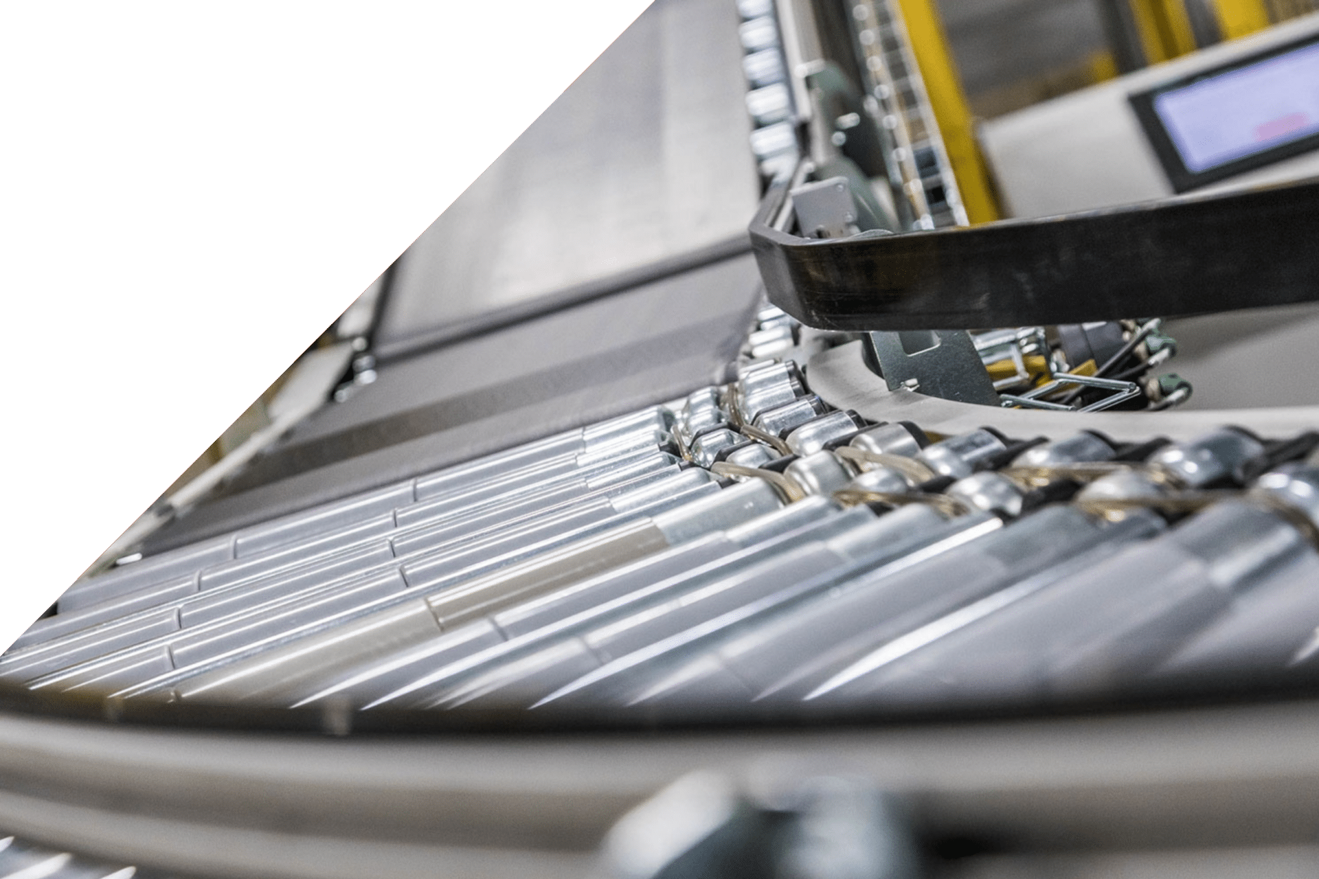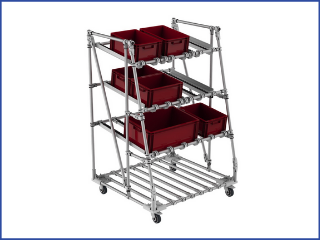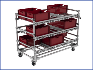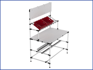 Les racks de production permettant une gestion Fifo (First in First out), c’est-à-dire l’approvisionnement en continu des produits. Le rack est composé de plusieurs niveaux d’approvisionnement multilingues avec un plan incliné pour une préhension ergonomique et d’un niveau inférieur dédié au retour de vide.
